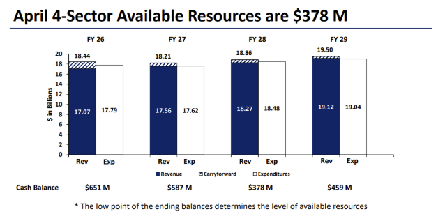 Projected cash balances have also narrowed over the budget window. Under the January forecast, the state anticipated approximately $577 million in discretionary spending available; however, the April forecast reduces available spending capacity to $378 million, with the lowest ending balance occurring in FY 2028. As the lowest ending balance effectively determines the ceiling for new ongoing commitments, this updated projection significantly limits the state’s capacity to take on additional spending while maintaining structural balance.