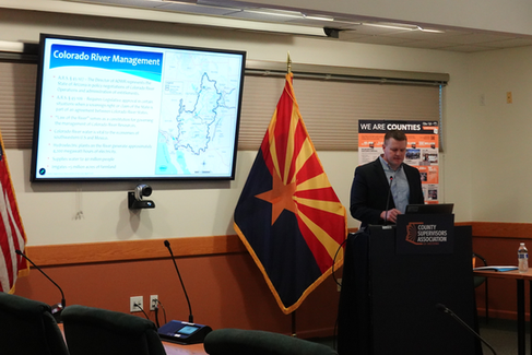 On Thursday, April 16th, Clint Chandler - Deputy Director from the Arizona Department of Water Resources - presented to supervisors and county professional staff as part of the CSA Learning Series, providing a high-level overview of Arizona’s water management. The presentation covered statewide water use, the agency’s role in managing supply, and ongoing coordination along the Colorado River, including declining reservoir levels at Lake Mead. Deputy Director Chandler also highlighted groundwater management efforts, challenges in rural basins, and the importance of long-term planning to sustain Arizona’s water future.