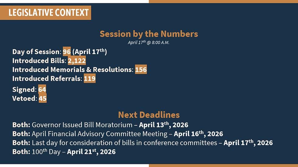As the 57th Legislature, 2nd Regular Session progresses, the Association will continue to provide updates on important deadlines as they pass. Please find additional deadlines linked here as well as listed below: